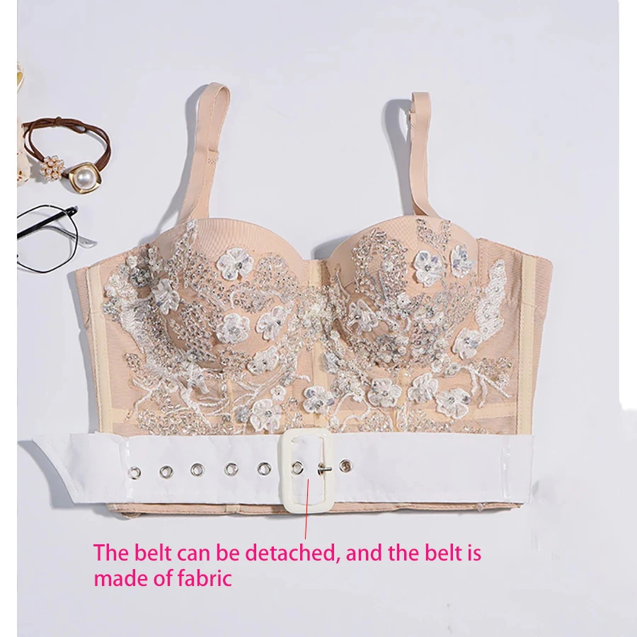 Summer Cropped Sexy Corset Tops Women Lace Beading Sashes Crop Top To Wear Out Camis With Built In Bra