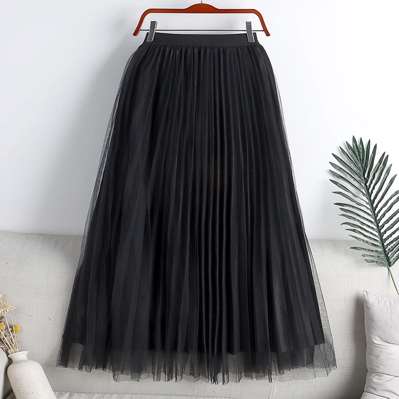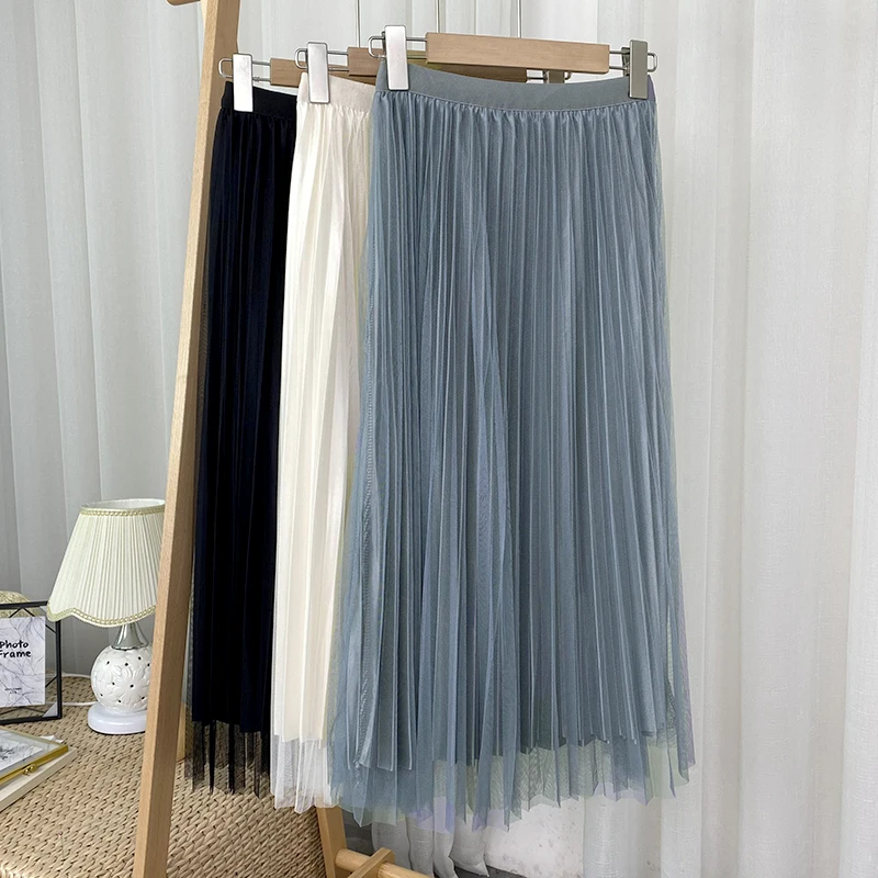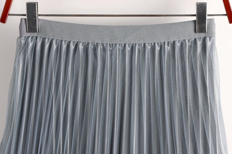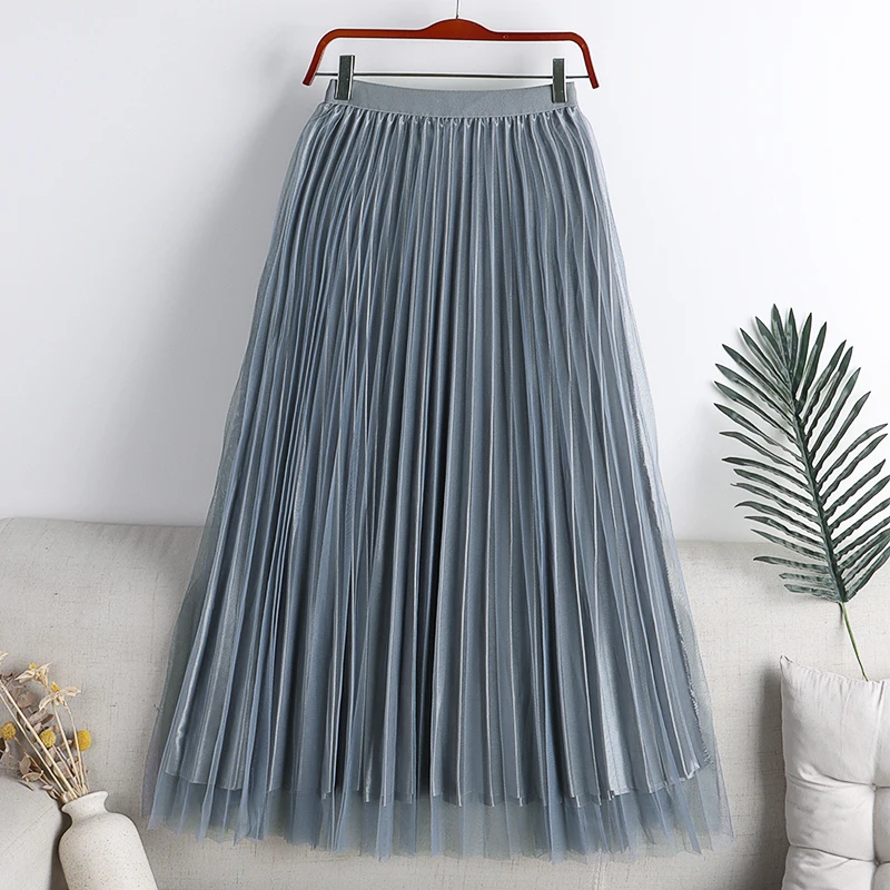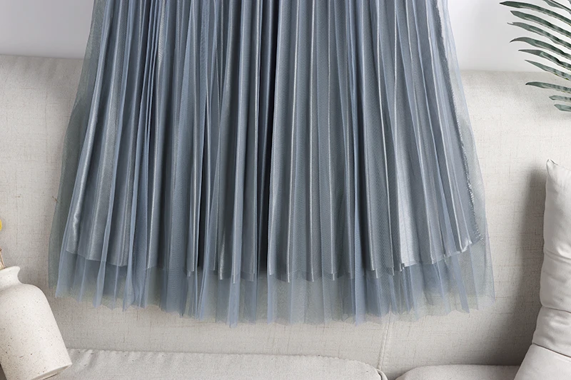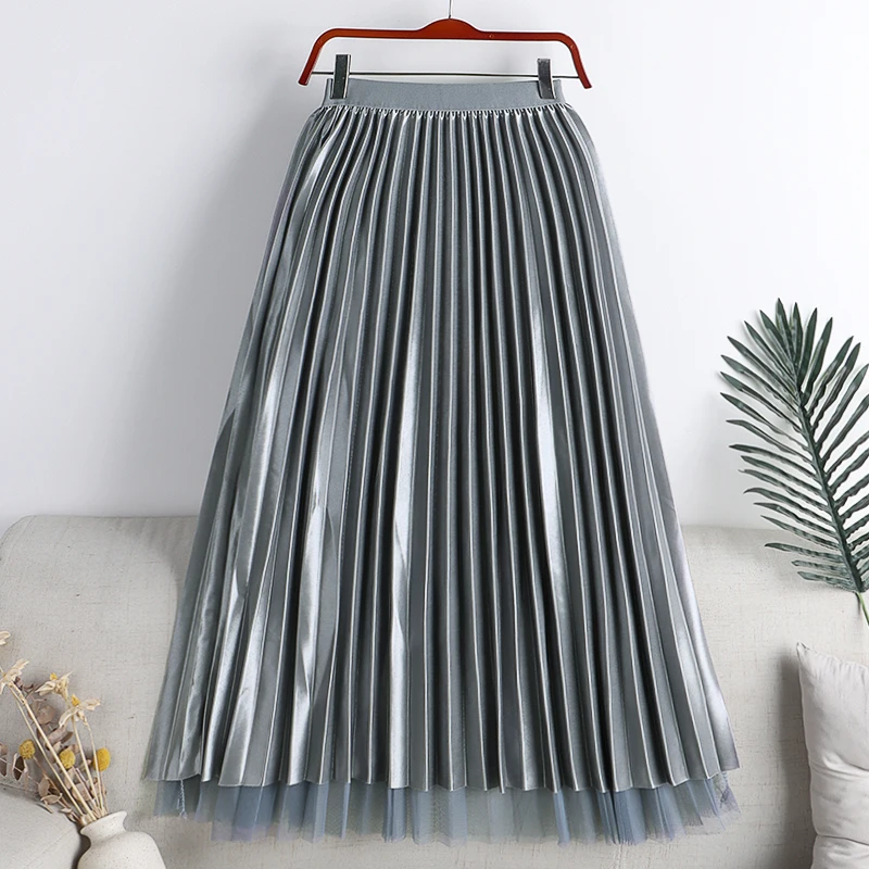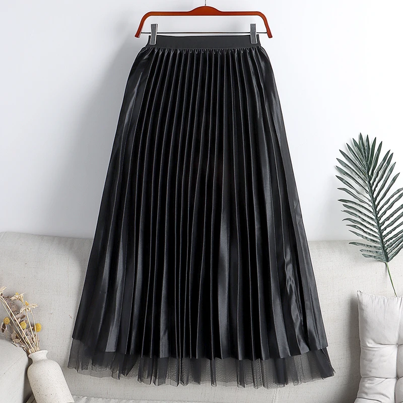 Fashion Satin Effect Lining Tulle Reversible Elegant Pleated Skirt Women High Waist Midi Skirt
