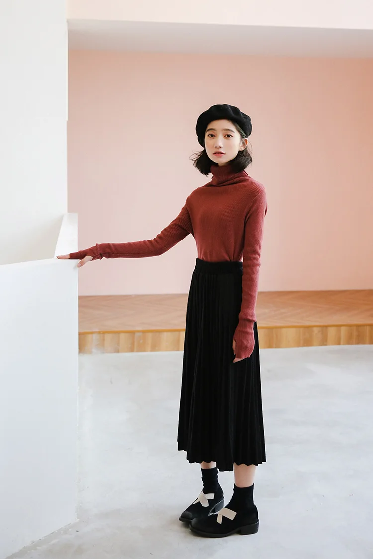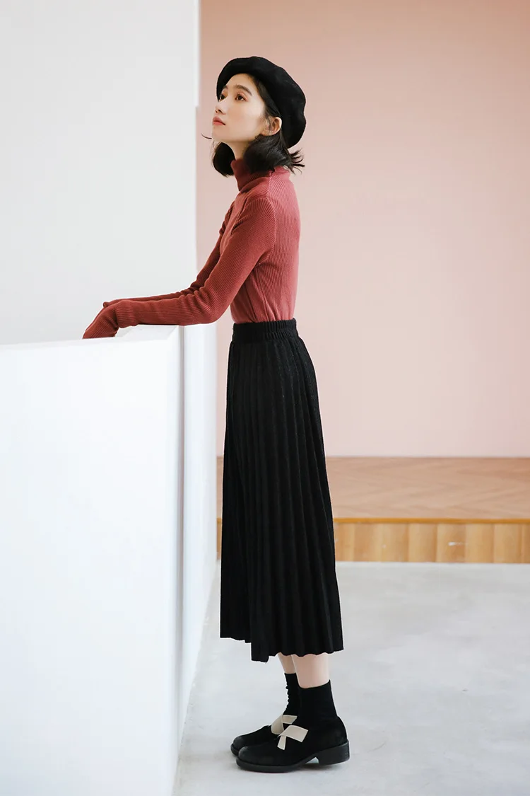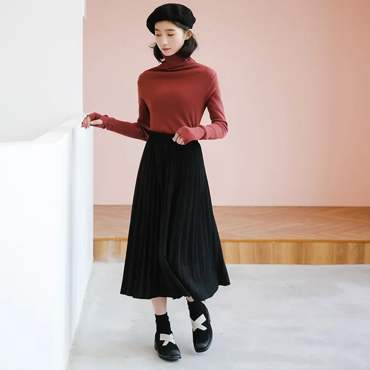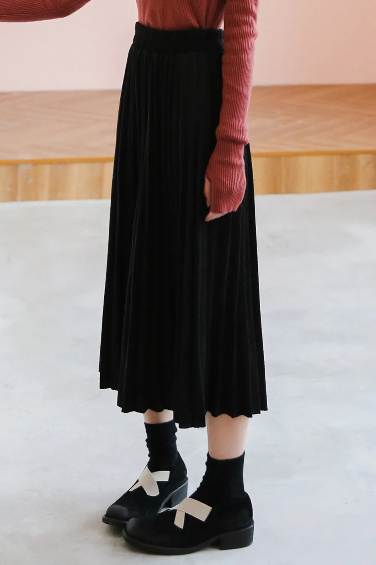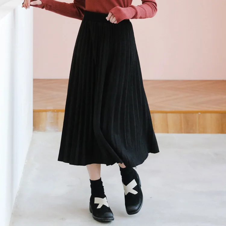 Women Black High Waist Pleated Skirts Korean Simple Style All-match Ladies A-line Long Skirt