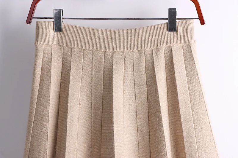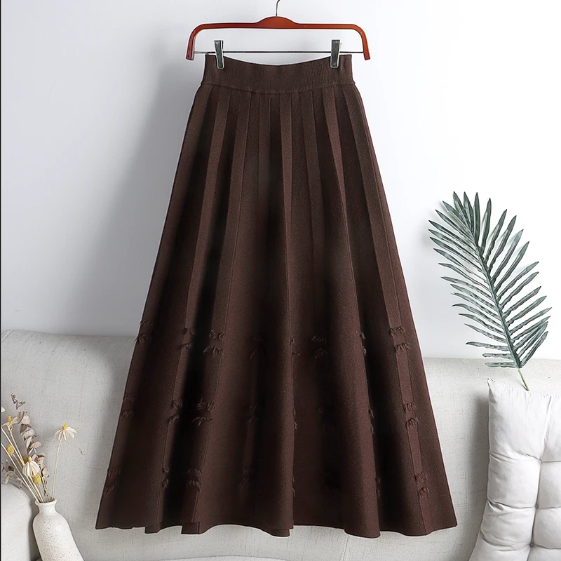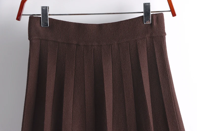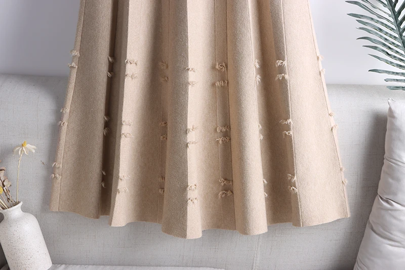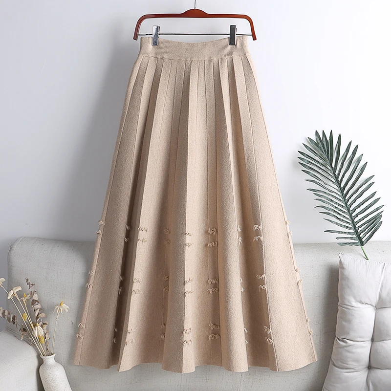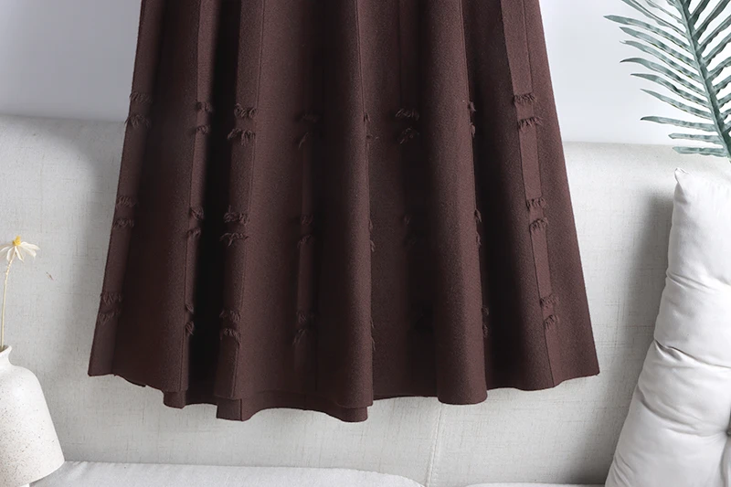 Women Winter Elastic High Waist Pleated Midi Skirt Frayed A Line Elegant Solid Knitted Skirts