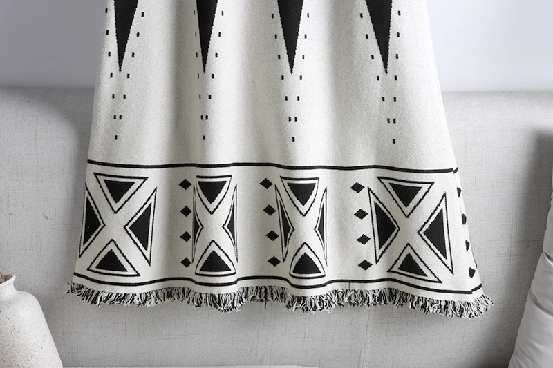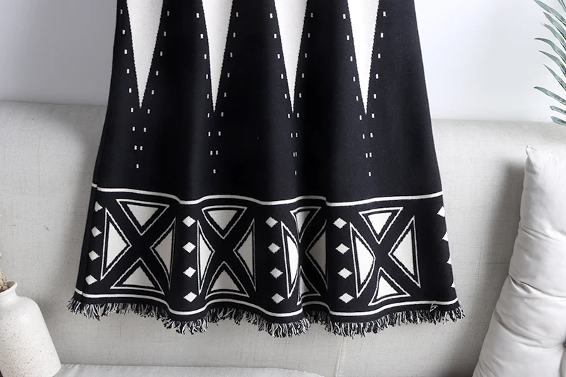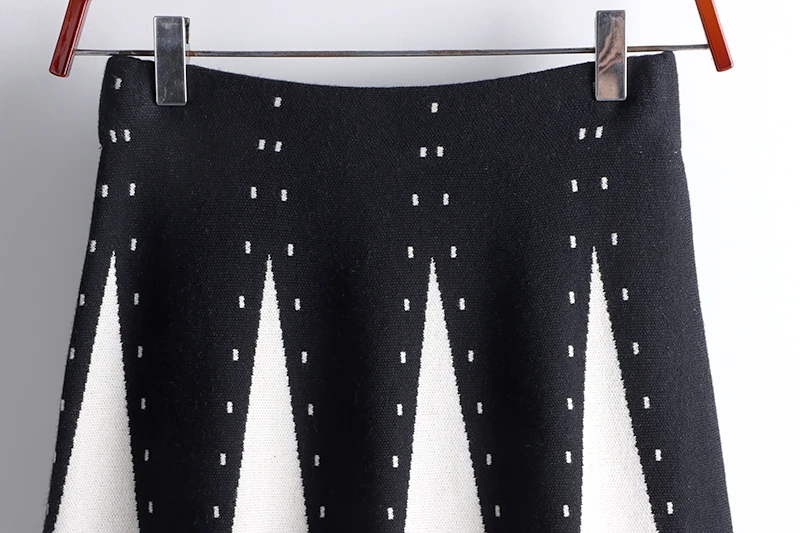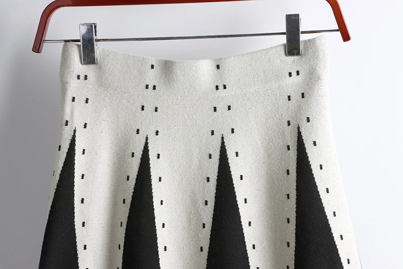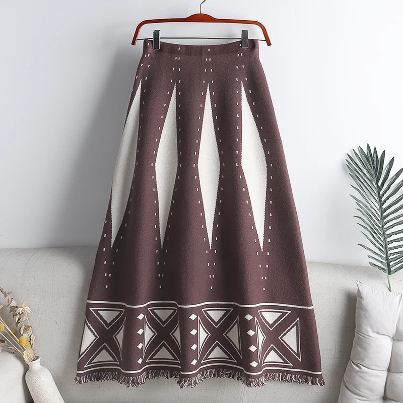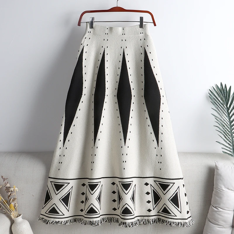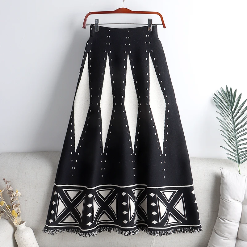 Elegant A Line Women Fringed Hem Contrast Geometric Knitted Skirts Elastic High Waist Midi Long Skirt