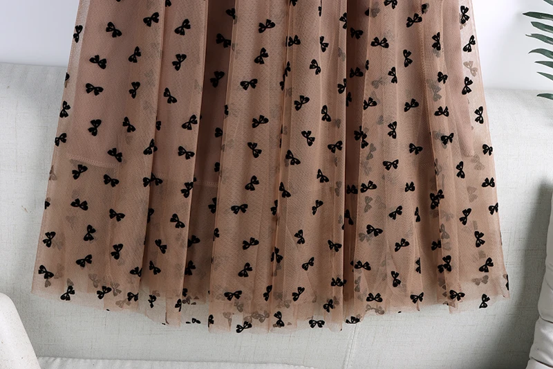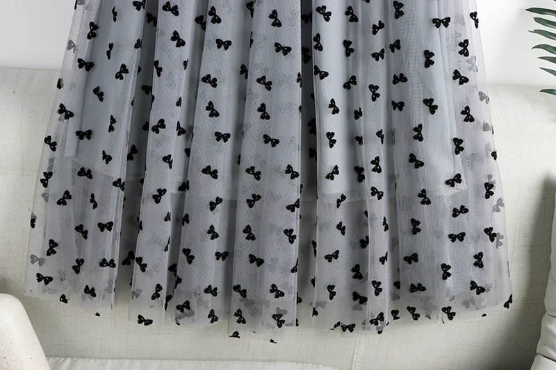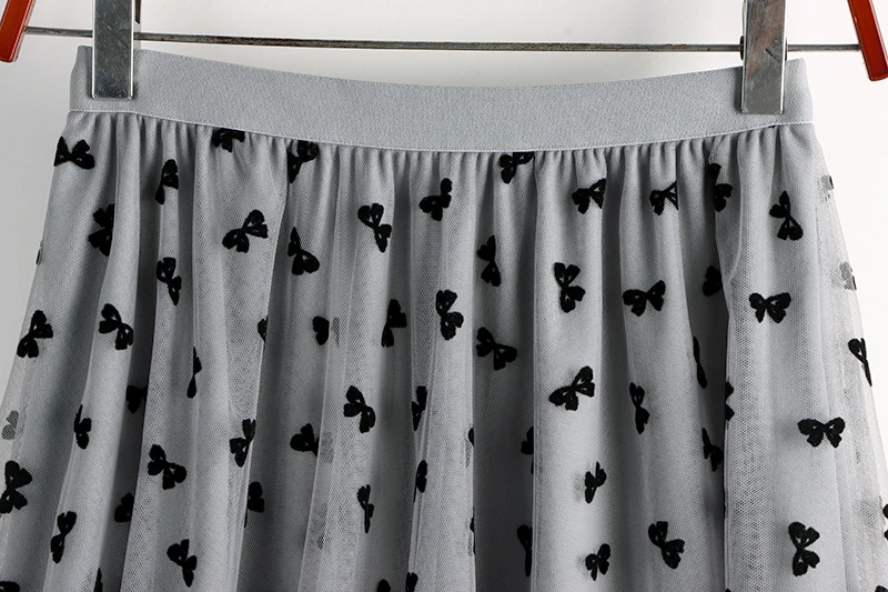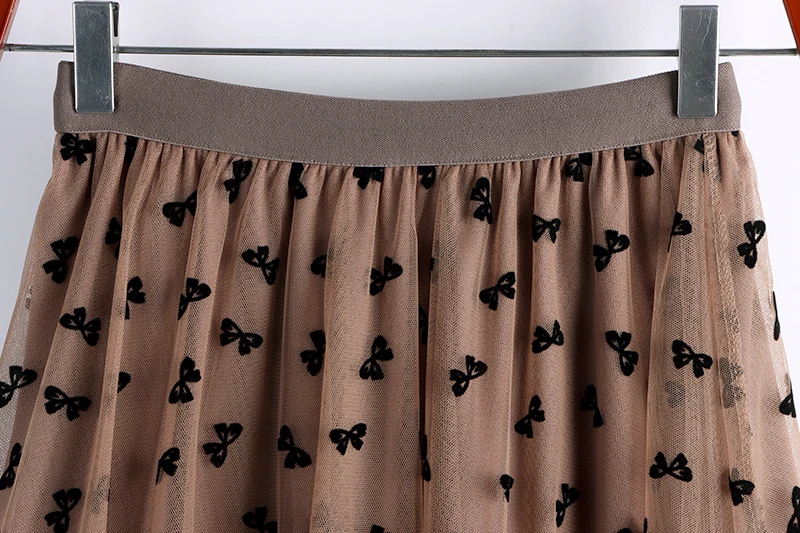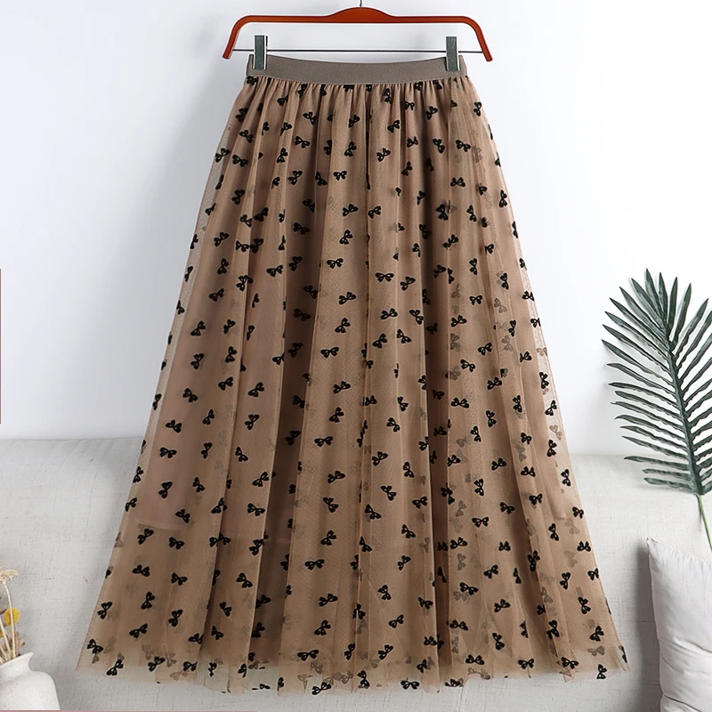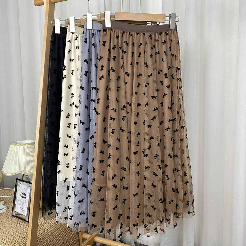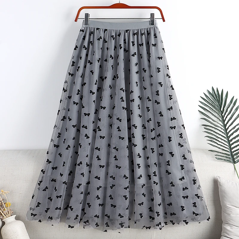 Elegant Long Women Butterfly Flocking Tulle Elastic High Waist Casual Mesh A Line Midi Skirt