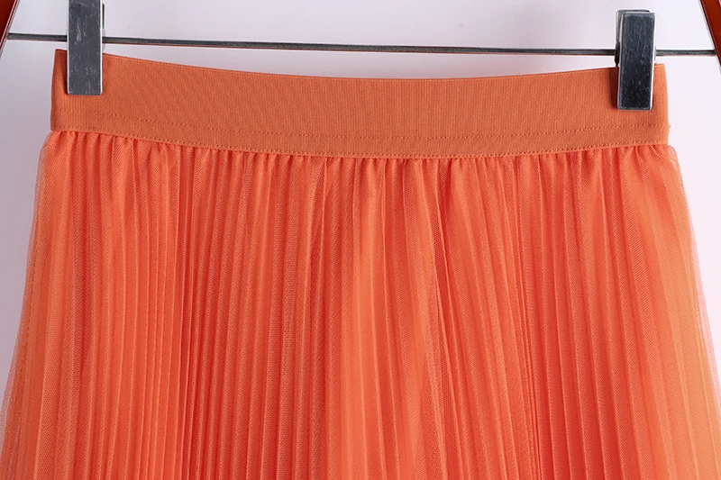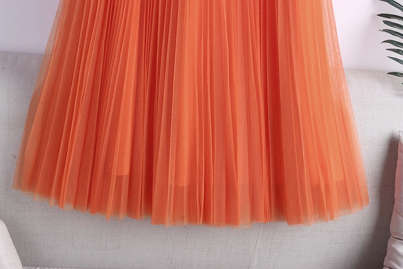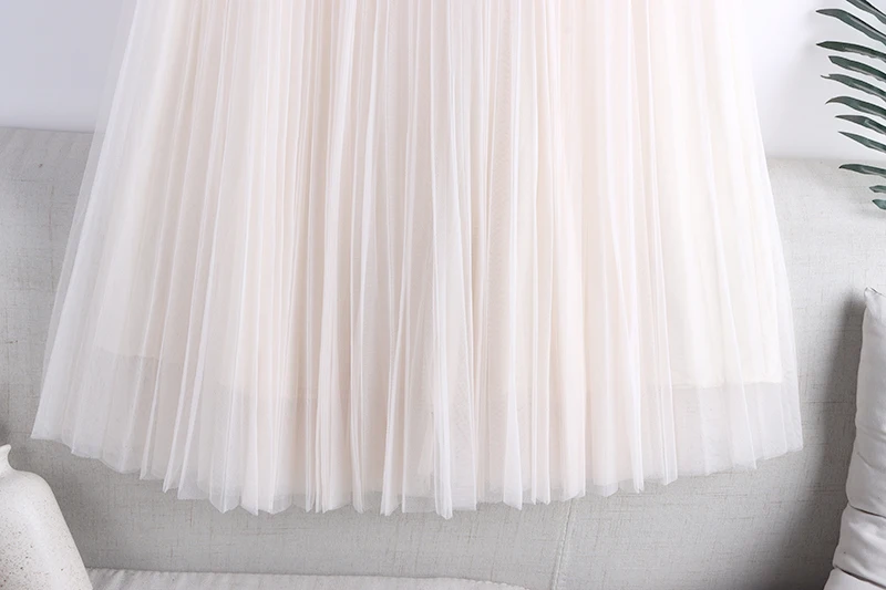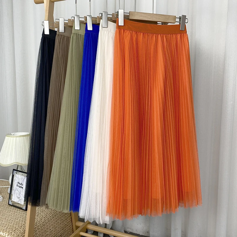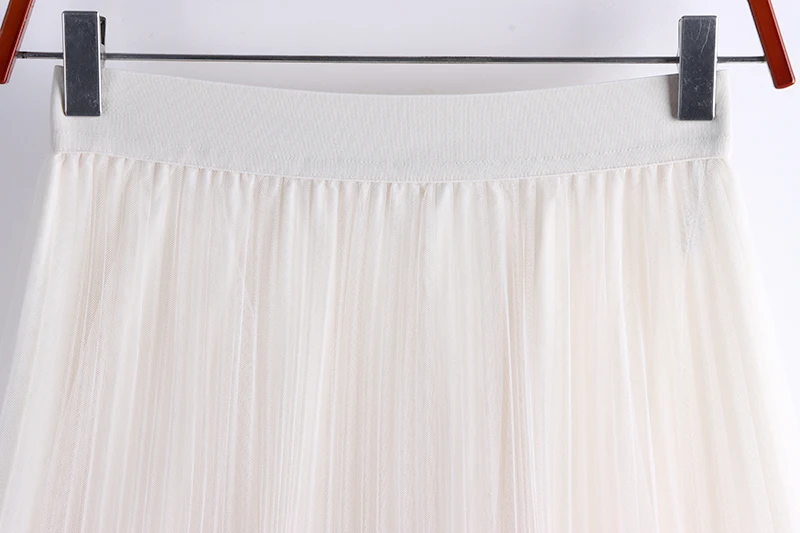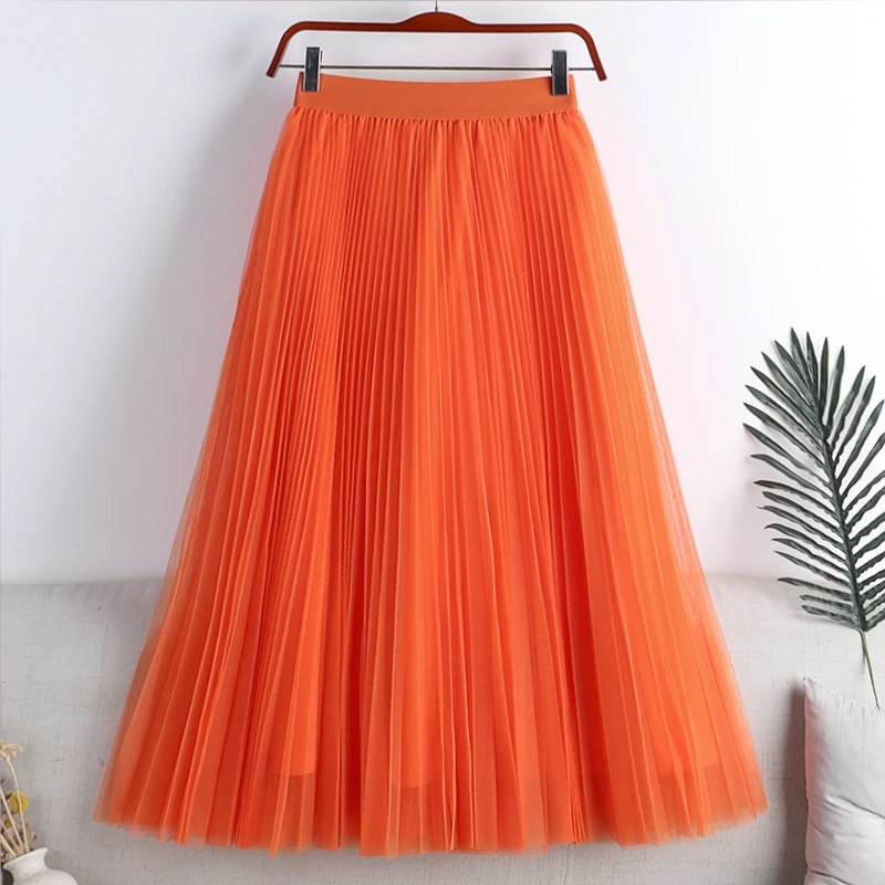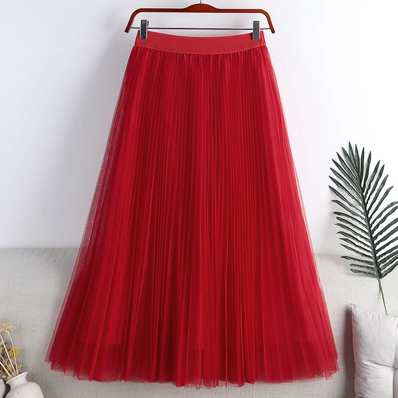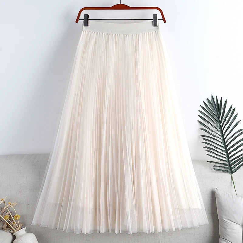 Elegant Tulle Pleated Skirt Summer Women Elastic High Waist Solid Casual Mesh Midi Skirt