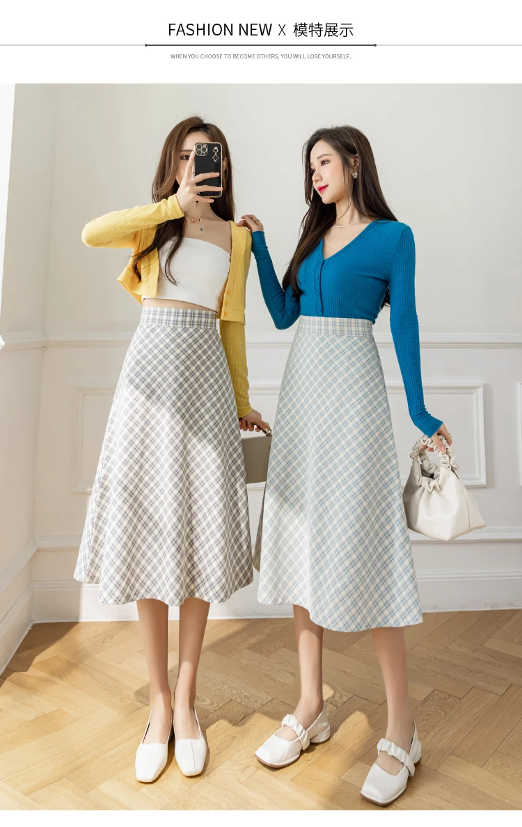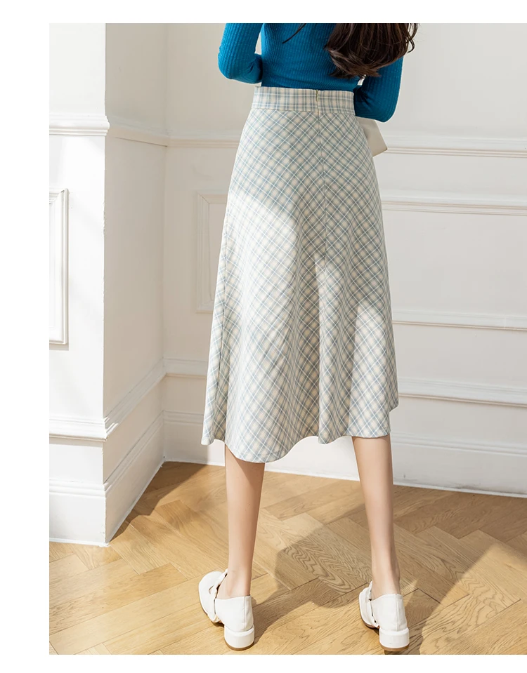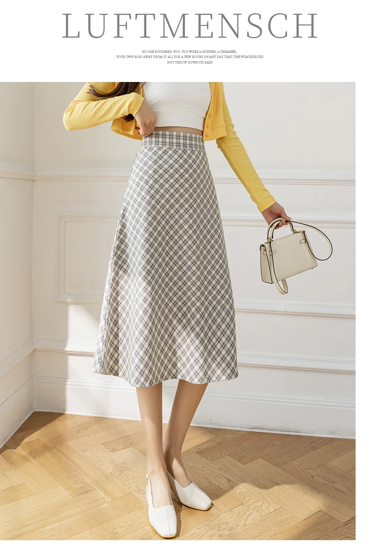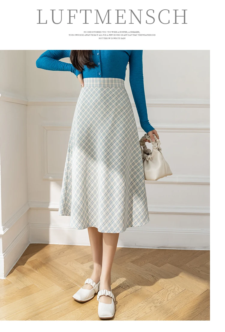 High Waist Elegant A-line Women Spring Korean Style Vintage Plaid All-match Ladies Long Skirt