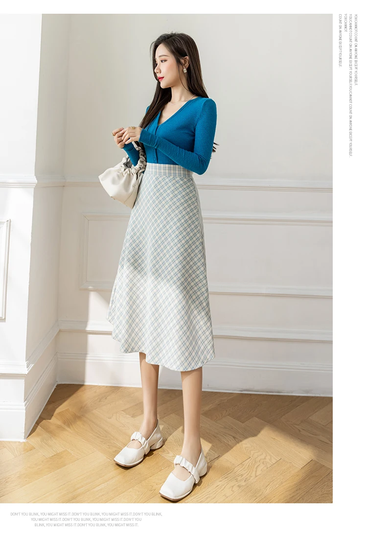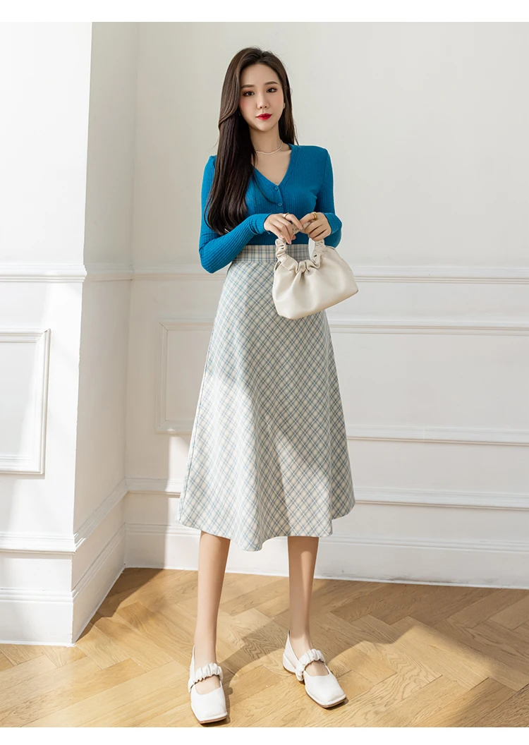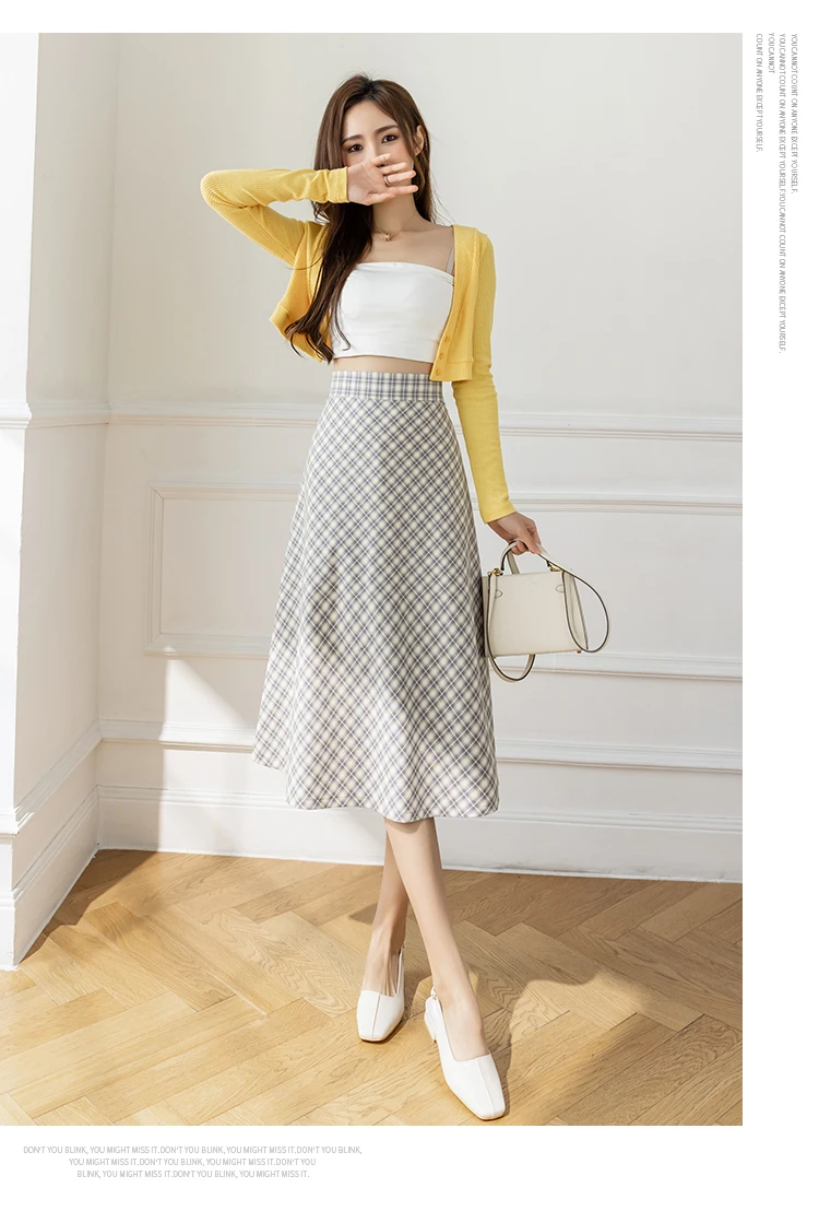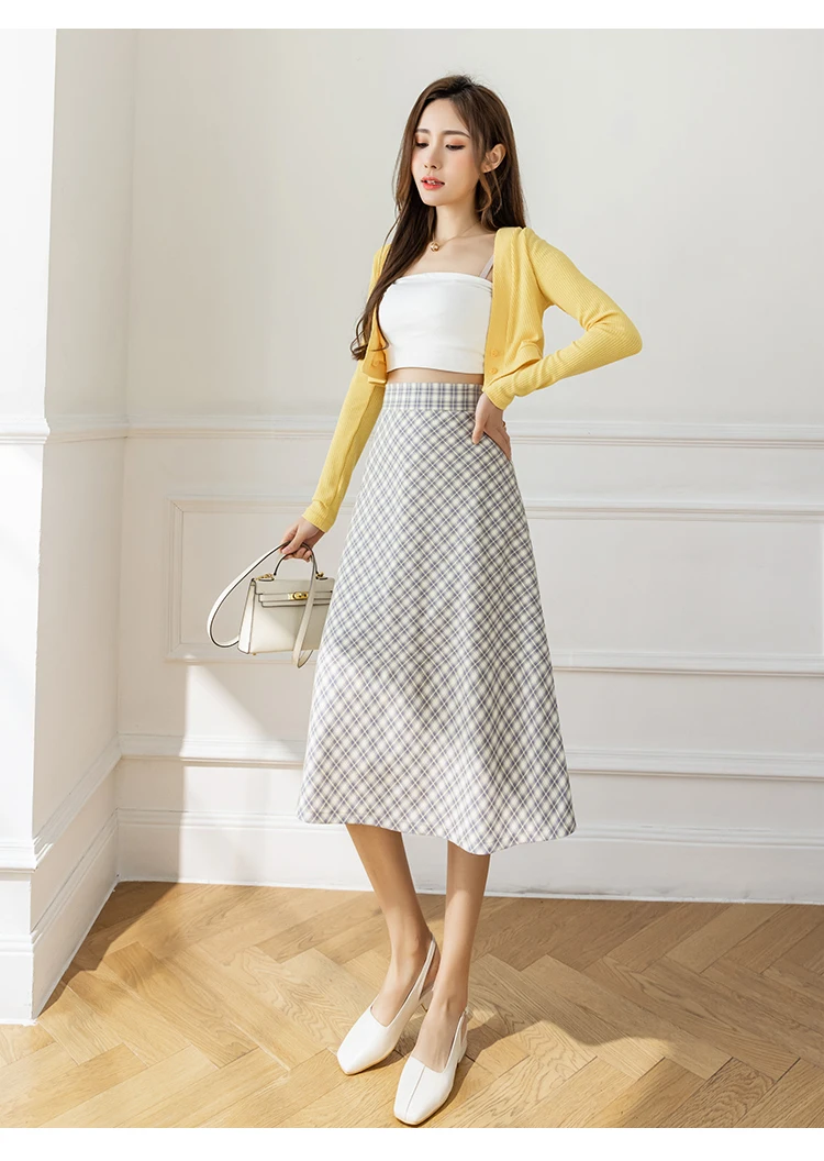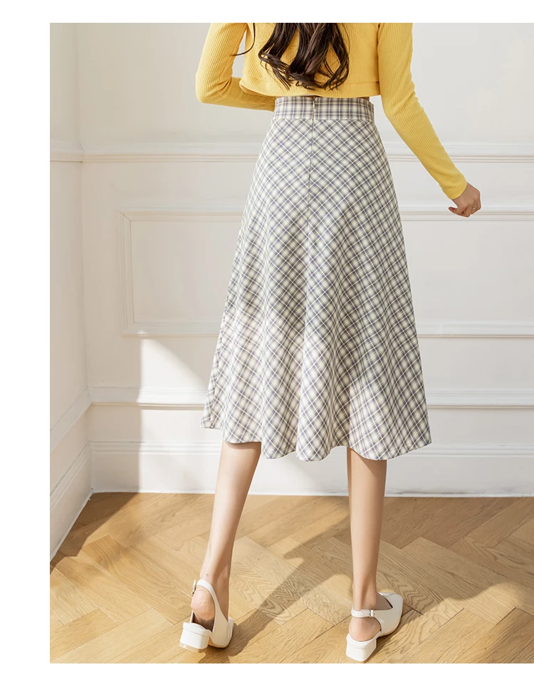 High Waist Elegant A-line Women Spring Korean Style Vintage Plaid All-match Ladies Long Skirt