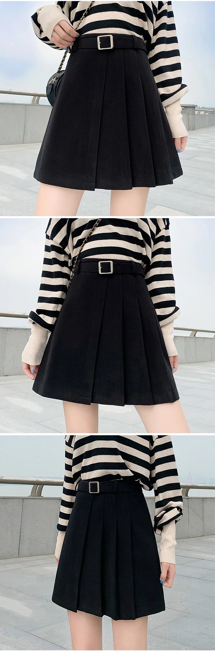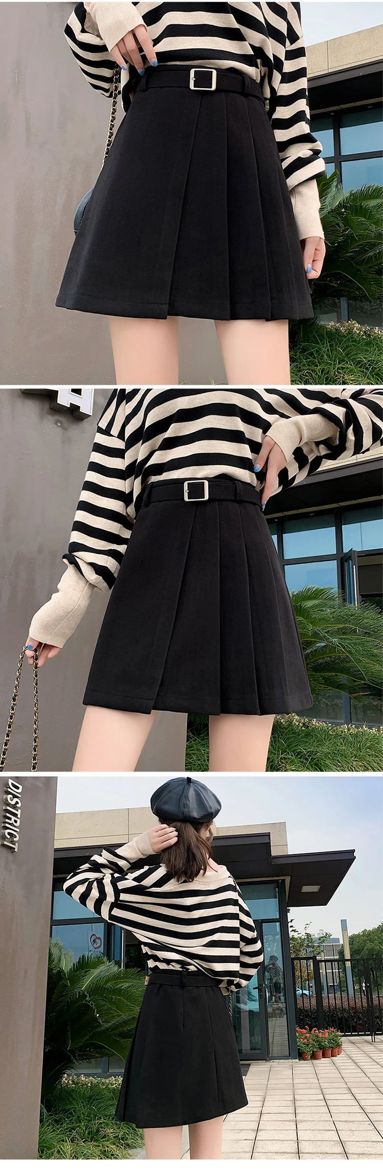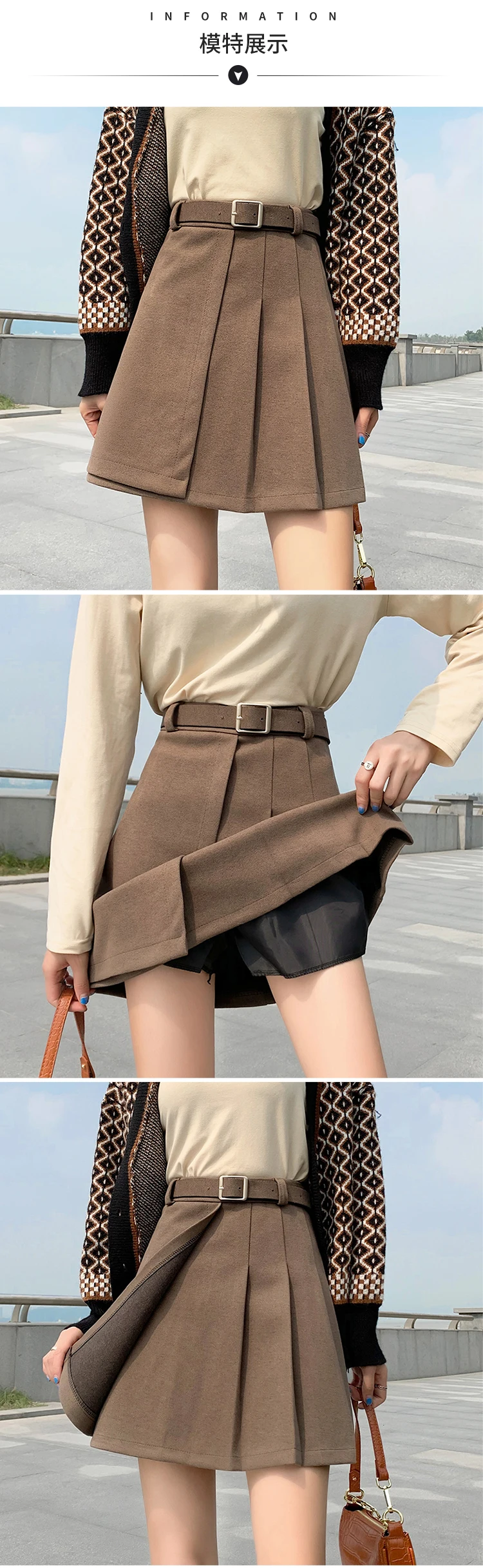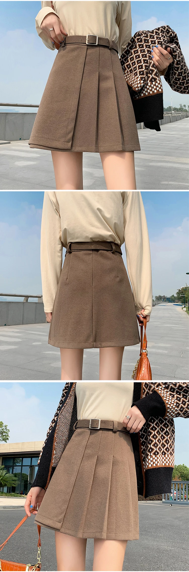 Ladies Elegant A-line Pleated Skirt Korean Style Vintage Woolen All-match Women Casual Mini Skirts With Belt