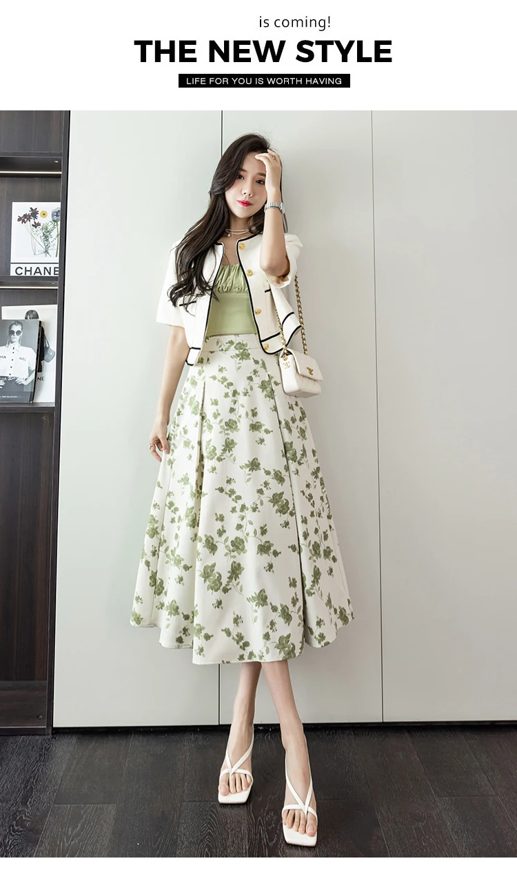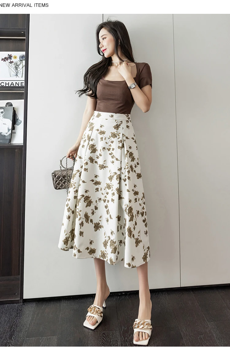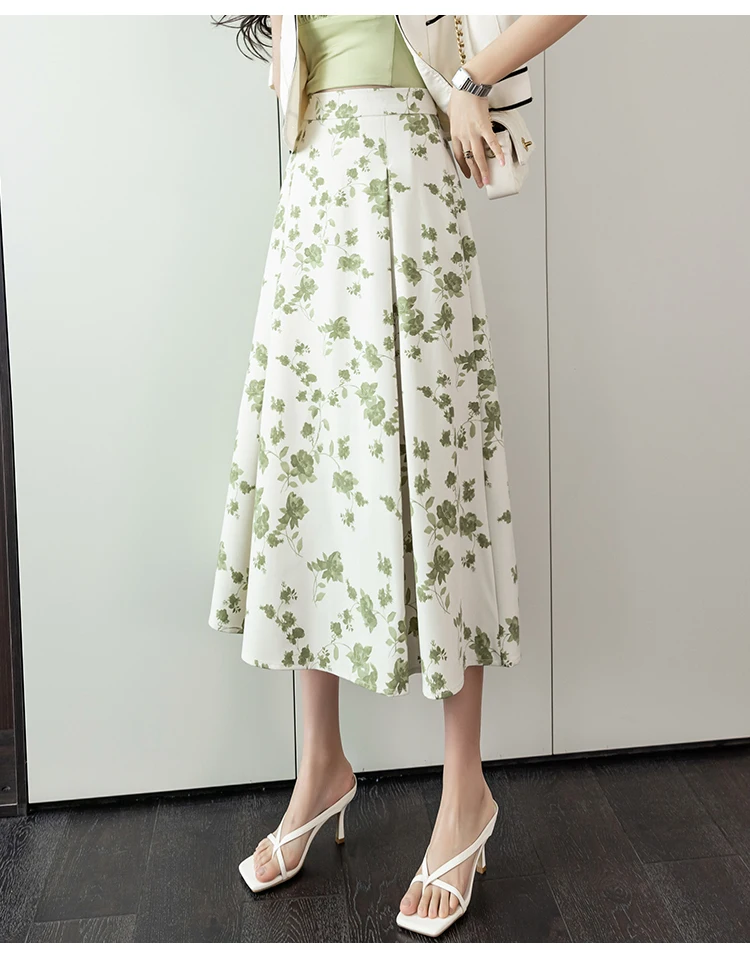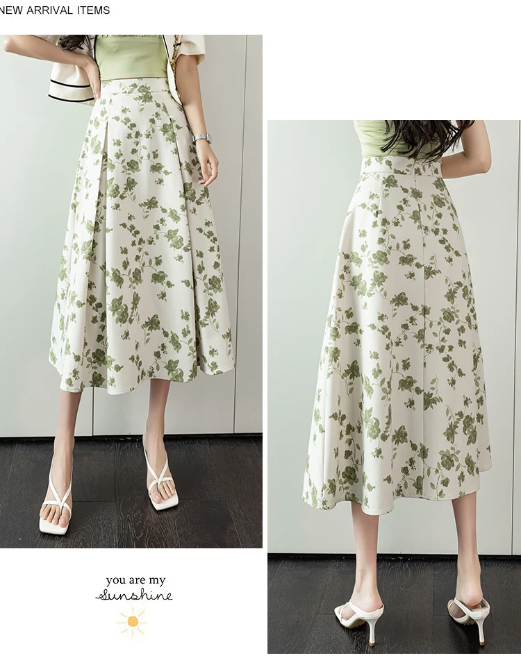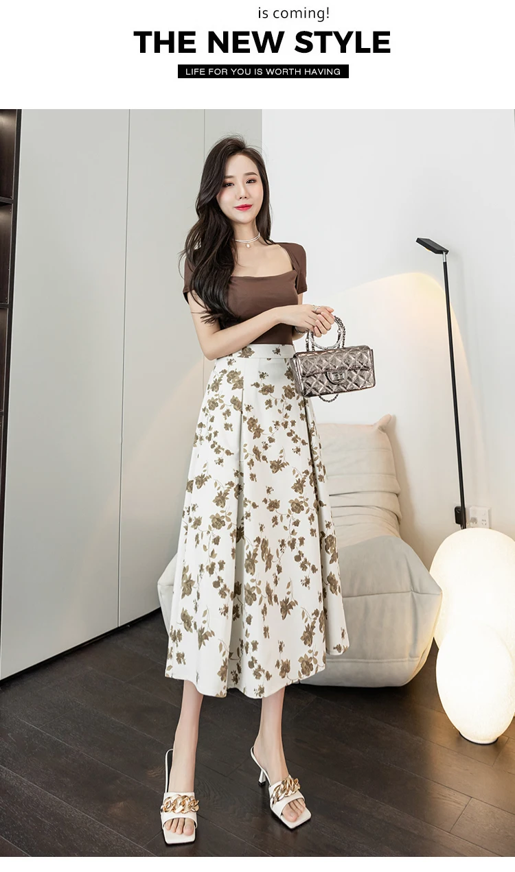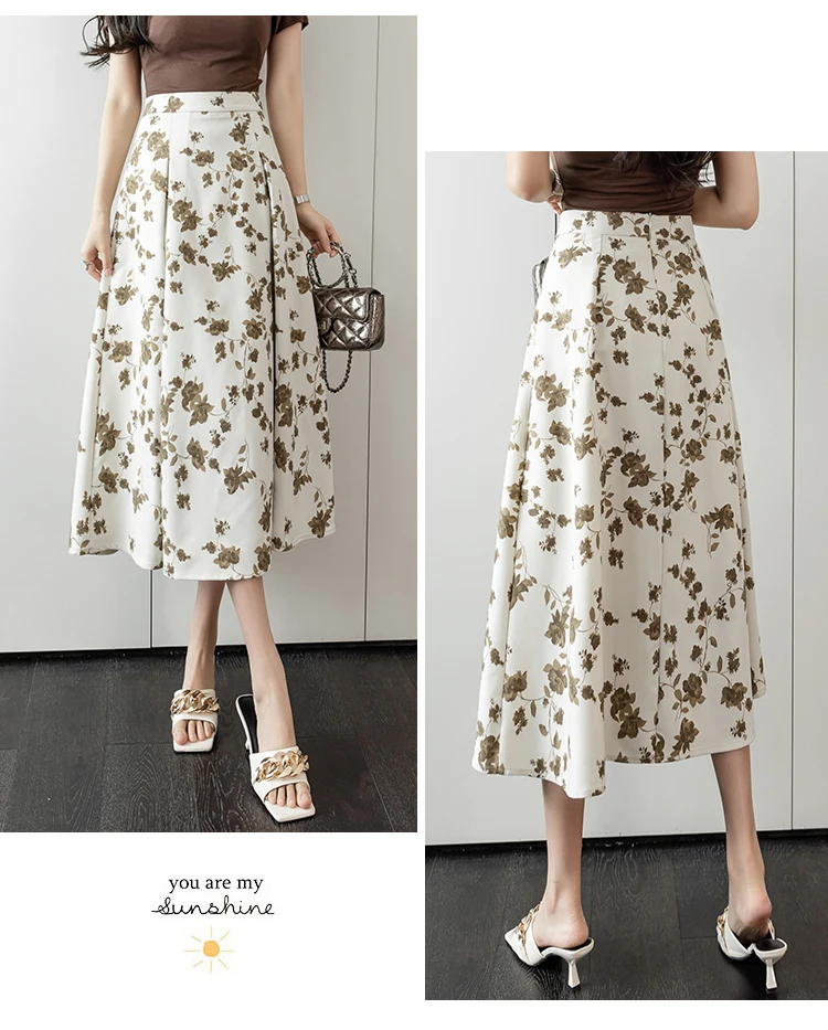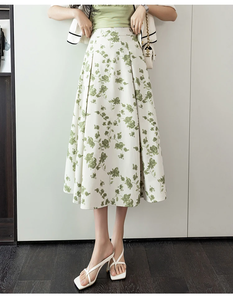 Ladies Elegant A-line Spring England Style Floral Print High Waist Women Long Party Skirt