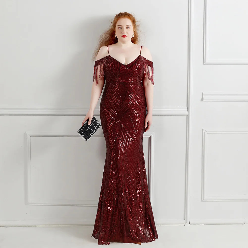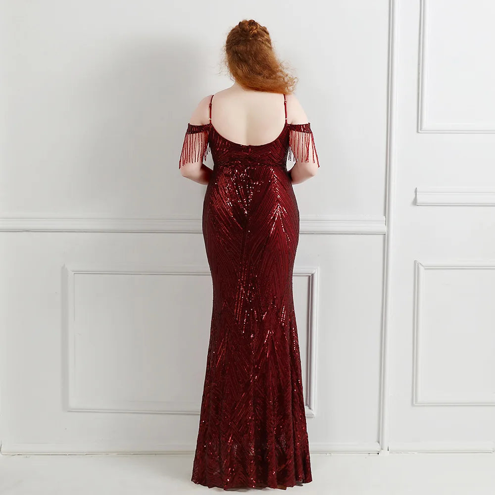 Plus Size Burgundy Sequin Dress Sexy Beading Evening Dress Women Party Strap Maxi Dress Long Prom Dress