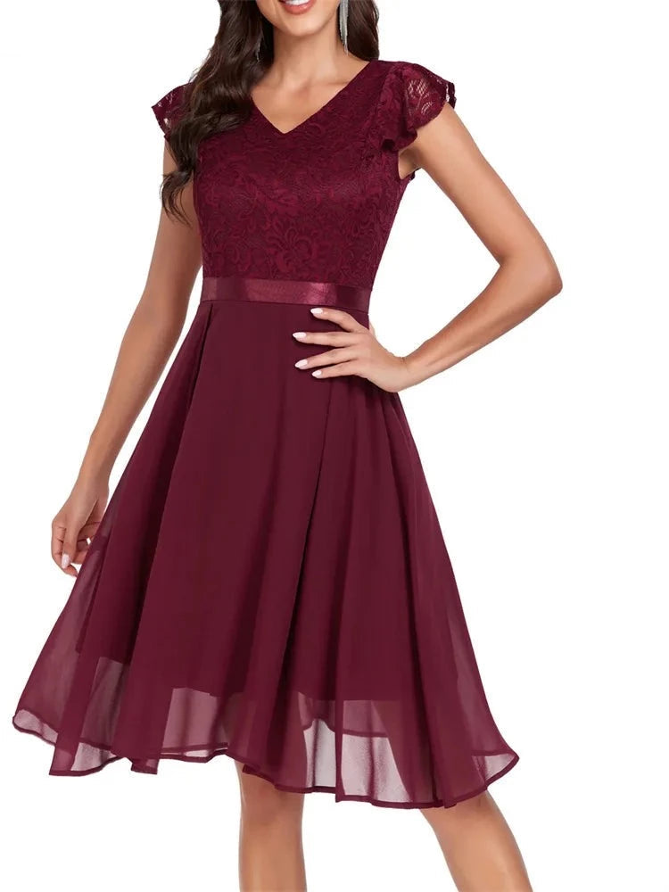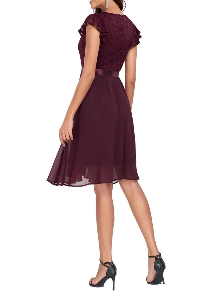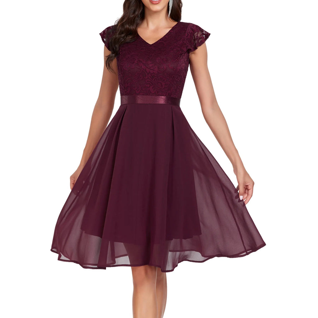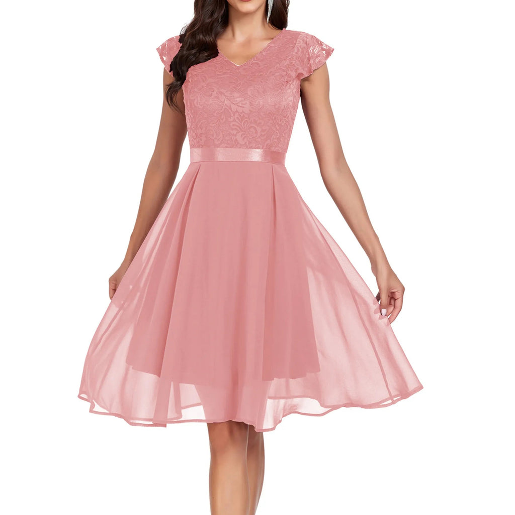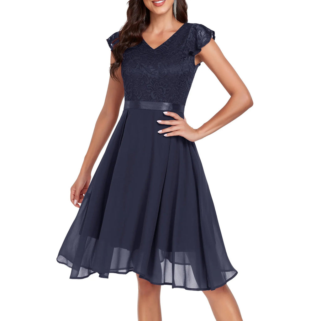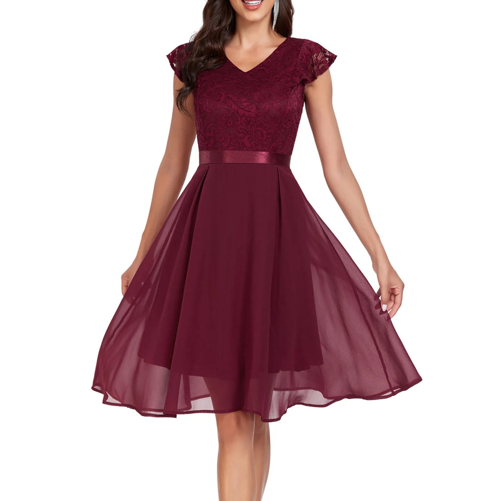Retro Lace Chiffon Short Party Ladies Elegant V Neck Formal Bridesmaid Summer Birthday Cocktail Evening Dress