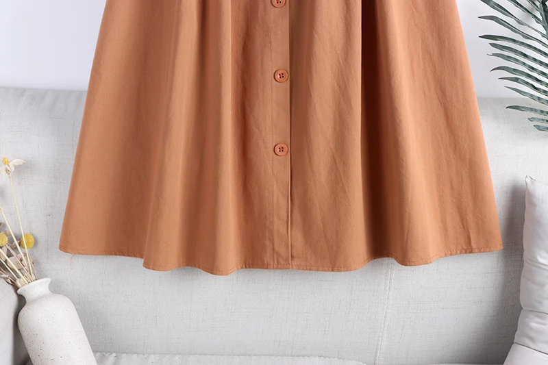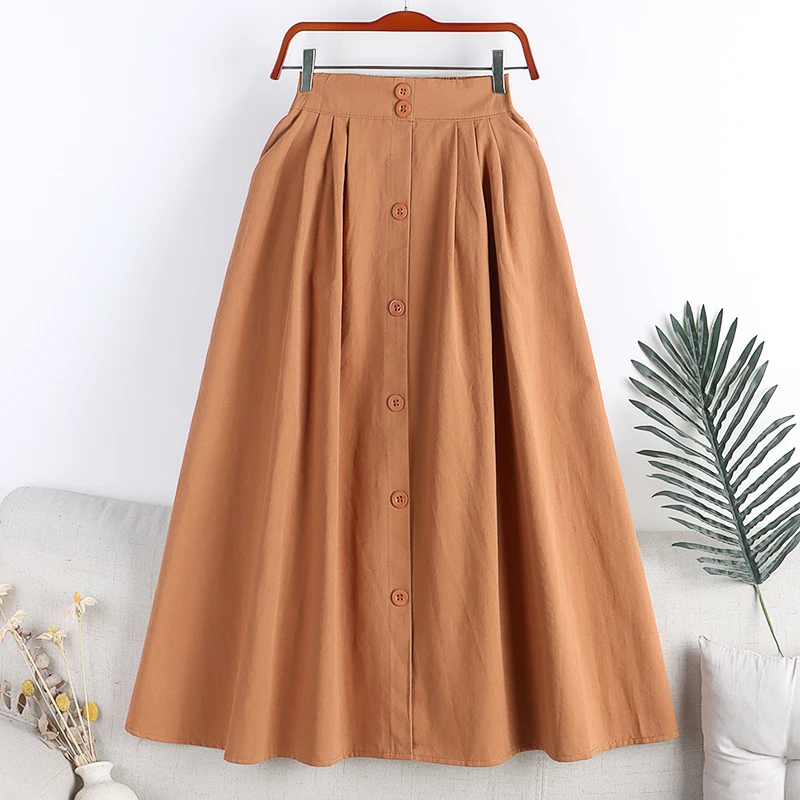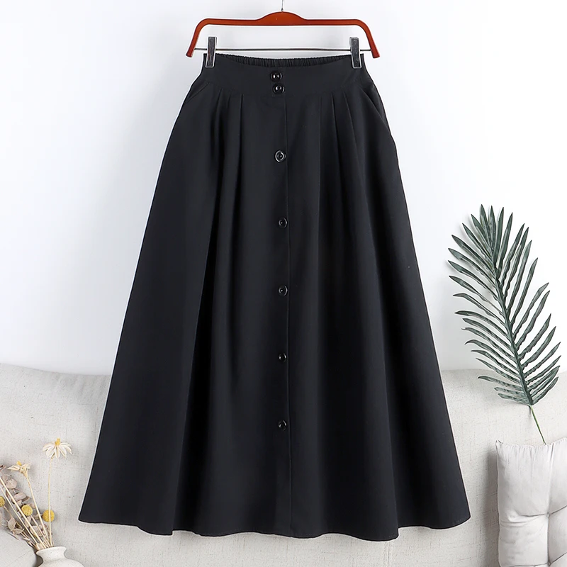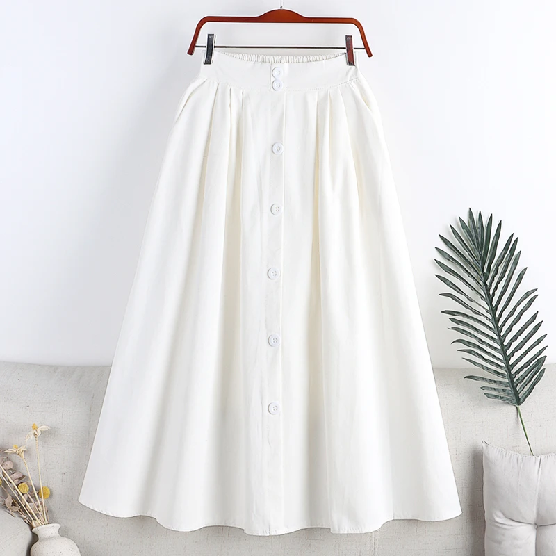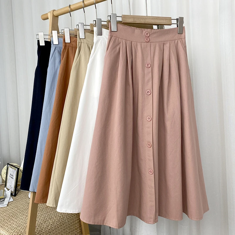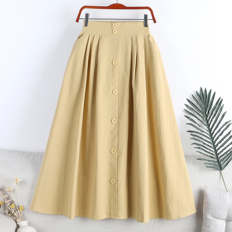 Spring Summer Front Buttons Big Swing A Line Side Pockets Elastic High Waist Casual Midi Skirt