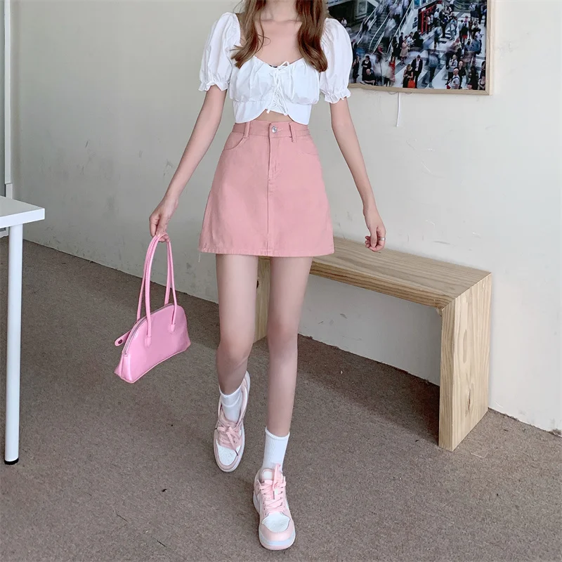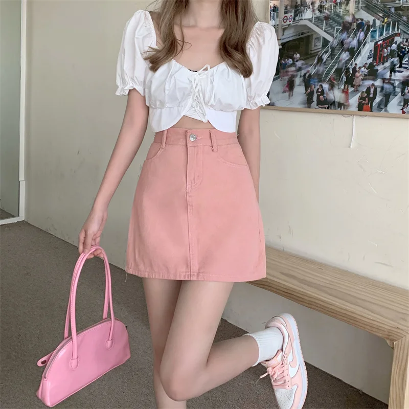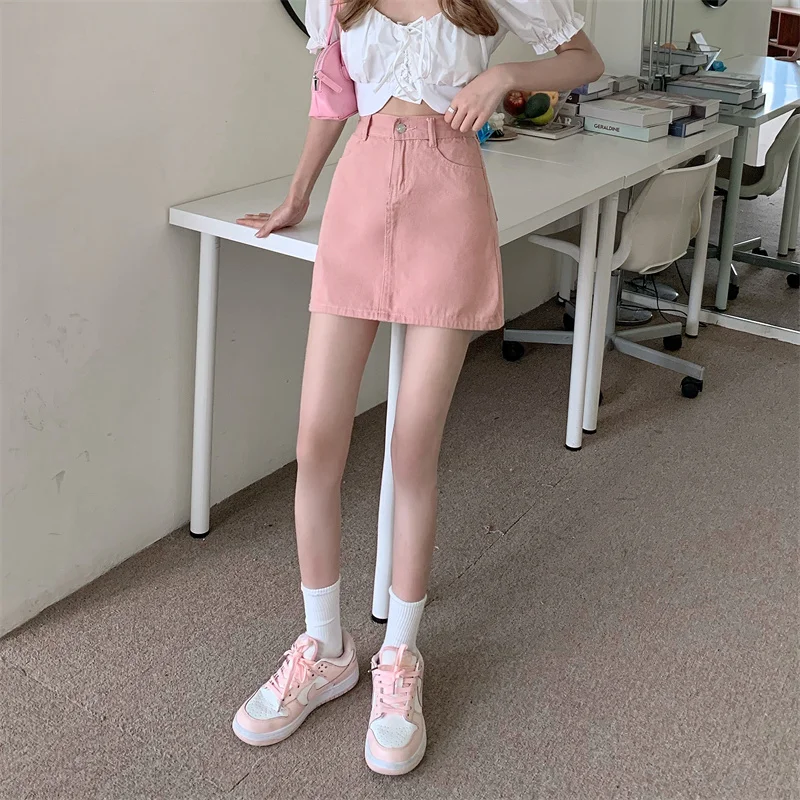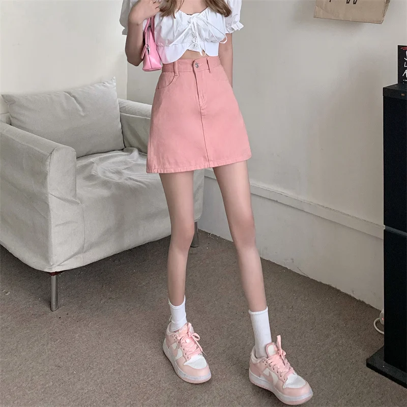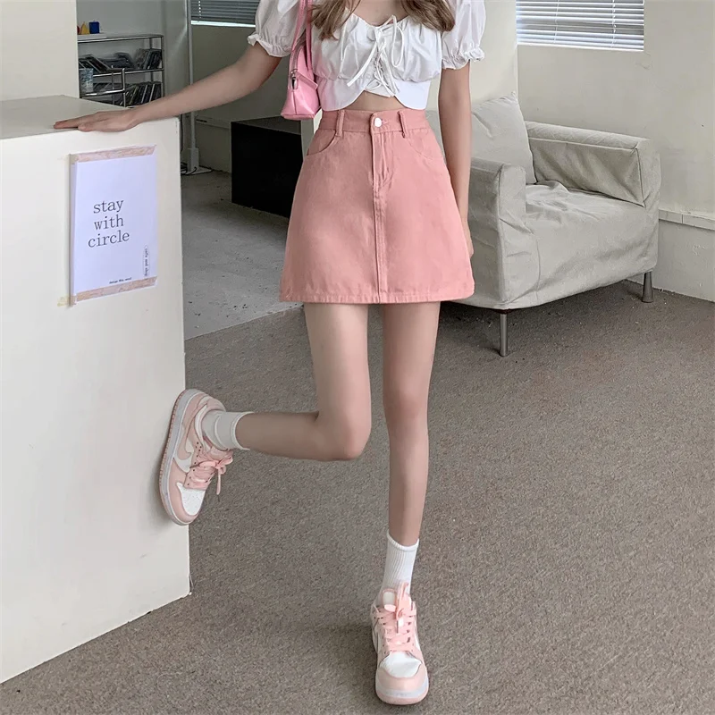 Women Denim Mini Skirts Korean Style All-match High Waist Ladies A-line Jean Short Skirt